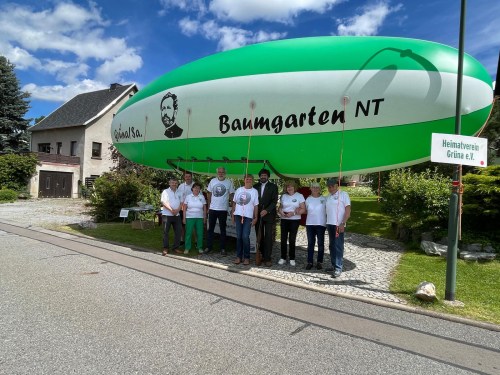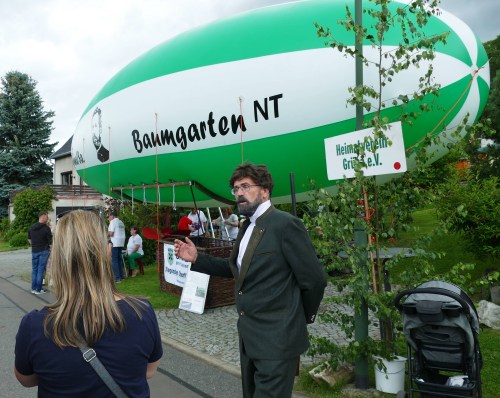 Auf Initiative des Borstendorfer Schnitzvereins machten sich deshalb 9 Mitglieder des Heimatvereins Grüna am 16. Juni auf den Weg nach Borstendorf und bauten ihren grün-weißen „Baumgarten NT“ neben dem Stand des Schnitzvereins auf – bei einer Länge von 10 Metern nicht gerade einfach in einem Vorgarten (die Tochter des Hausherrn hat sicherheitshalber noch ein paar Zweige eines stachligen Strauches entfernt, denn Stiche in die Hülle sind tödlich für das Luftschiff).