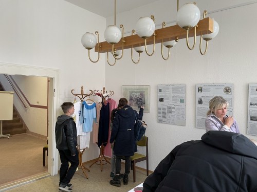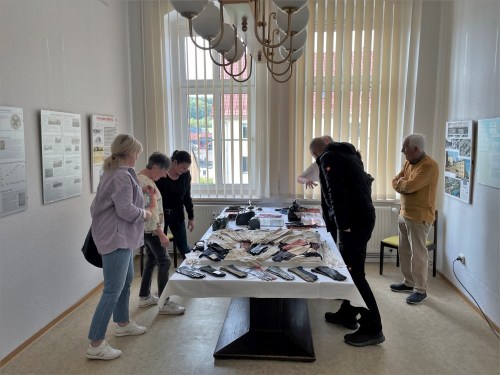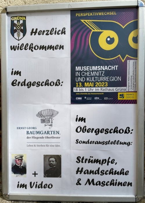So schunkel-froh und zufrieden waren wir in der Nacht des 13. Mai, als wir nach 190 gezählten Besuchern die Rathaustüren schließen konnten. Schon mit dem ersten Bus vor 18 Uhr hatte ein Ansturm begonnen, der fast pausenlos alle Räume füllte, das heißt unsere Baumgarten-Wölfert-Gedenkausstellung im Erdgeschoß, oben der Ratssaal mit einem Video zum Thema „Luftschiffe früher und heute“, und der Nebenraum mit Erinnerungen an die Industriekultur Grünas: die Strumpf-, Handschuh- und Textilindustrie sowie den (Drahtzieh-)Maschinenbau. Ein Video erklärte hier anschaulich die Funktion eines Strumpfwirkstuhles, wie er in der Baumgartenausstellung im Original zu sehen ist. Wieder präsentierte Karla Krahmer, Inhaberin der letzten Grünaer Textilfirma, ein umfangreiches Sortiment von Handschuhen und Trikotagen aus ihrer Produktion sowie einige historische Gerätschaften. Gern gab sie den Besuchern sachkundige Antworten auf alle ihre Fragen. Und wieder war sie begeistert von dem Interesse, welches diesem Thema entgegengebracht wurde.