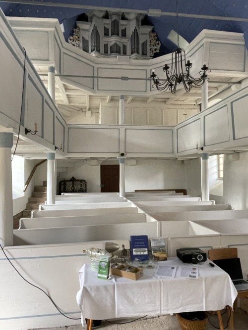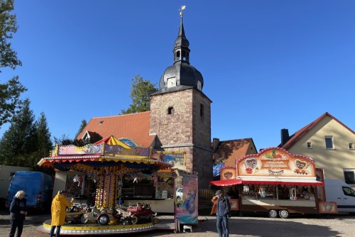 Der Vortrag fand vor etwa 25 Zuhörern in einem wunderschön sanierten winzigen Kirchlein statt, gleich neben dem Kirmesgelände. Überhaupt ist Schönfeld ein sehr hübsches Dörfchen. Gleich dahinter fließt die Unstrut, und ein wenig scheint die Zeit hier stehengeblieben.